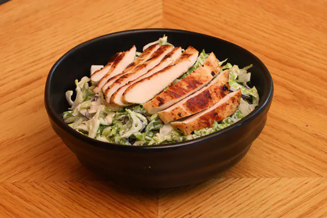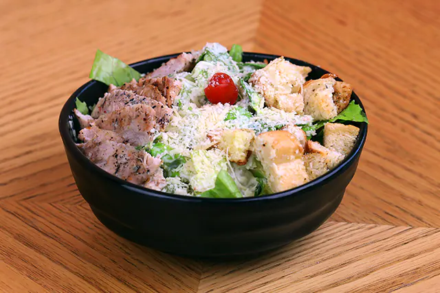 خس روماني، خبز محمص، دجاج مشوي، بارميزان، صلصة سيزر