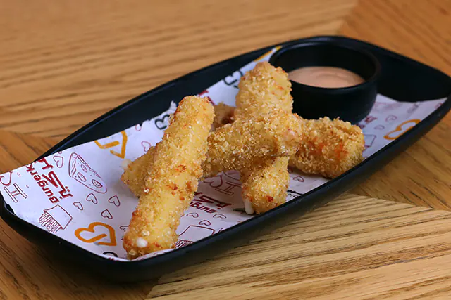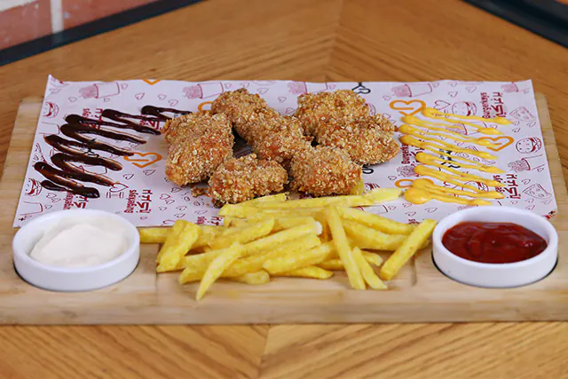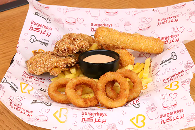 ٤ قطع من حلقات البصل، ٢ قطعة من أصابع الموتزريلا، ٢ قطعة من دجاج تندر، بطاطا مقلية، تُقدم مع صوص الكوكتيل