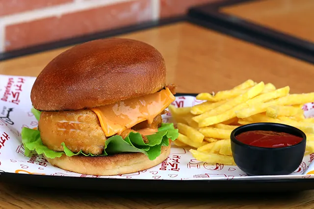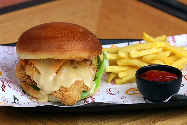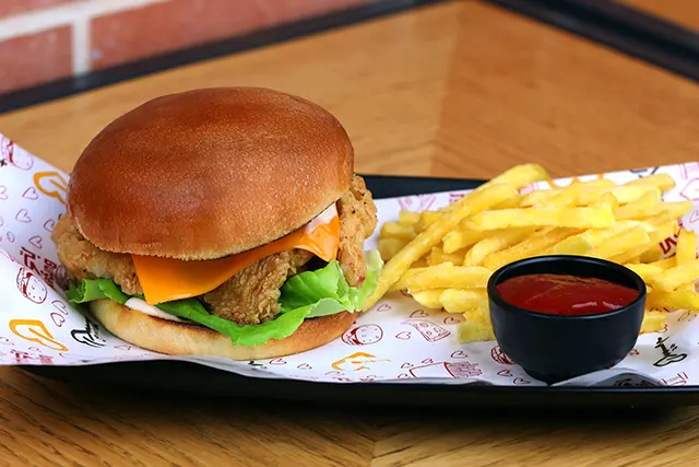 خبزة البرغر، صدر دجاج مقلي، جبنة التشيدر، خس، مايونيز.اختيارك من: ○ كلاسيك ○ حار ○ باربكيو