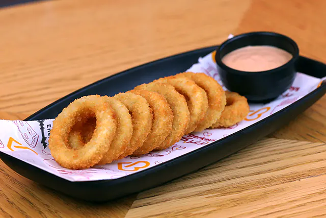 حلقات بصل مقلية مقرمشة تقدم مع صوص كوكتيل