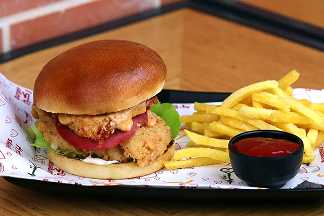 Burger bun, fried chicken breast, cheddar, lettuce, mayonnaise.Your choice of: ○ Classic ○ Spicy ○ BBQ