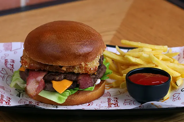 Burger bun, 2 pieces of charcoal grilled beef, beef bacon, cheddar, grilled fat, fried mozzarella, lettuce, 2 pieces of onion rings, our special burgerkeys sauce
