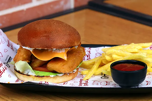 Burger bun, tempura battered fried fish, cheddar, tomato, tartar sauce