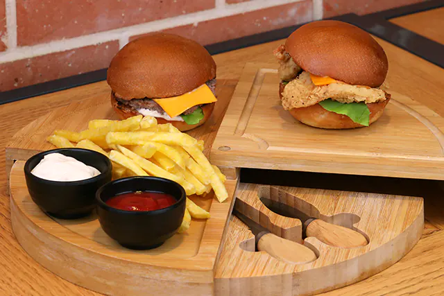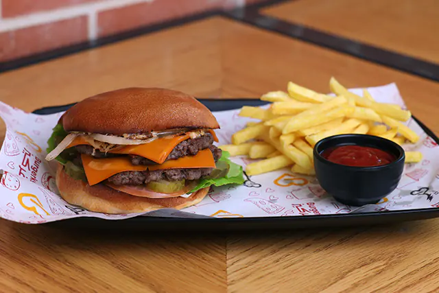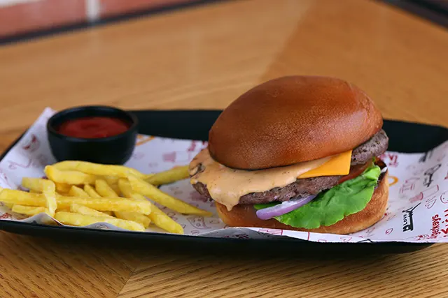 خبزة البرغر، لحم بقري مشوي على الفحم، بصل، مخلل، طماطم، خس، صلصة البرغر الخاصة.اختيارك من:○ كلاسيك ○ جبنة تشيدر ○ بيض