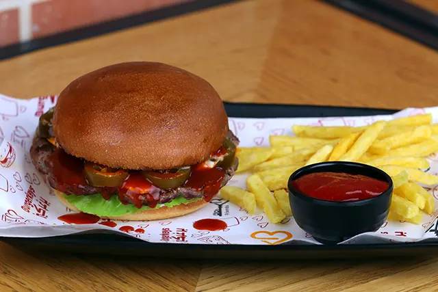 Fresh burger bun, charcoal grilled beef, cheddar, spicy sauce, jalapeno, lettuce, our special burgerkeys sauce