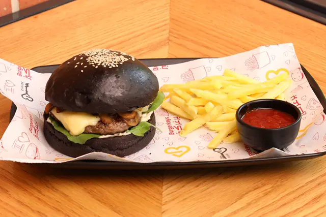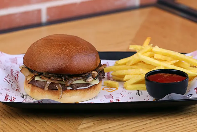 Burger bun, charcoal grilled beef, Emmental cheese, caramelized mushroom, caramelized onions, arugula, mayonnaise