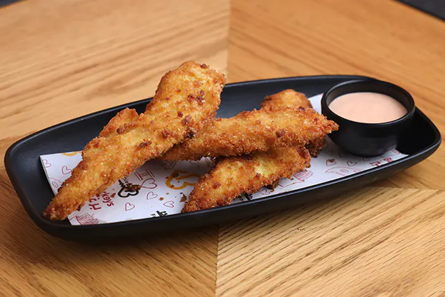Crispy fried chicken tender served with cocktail sauce