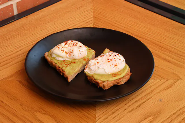 التوست الصحي بالسبع حبوب، بيض بوشيه، صوص الغواكامولي.