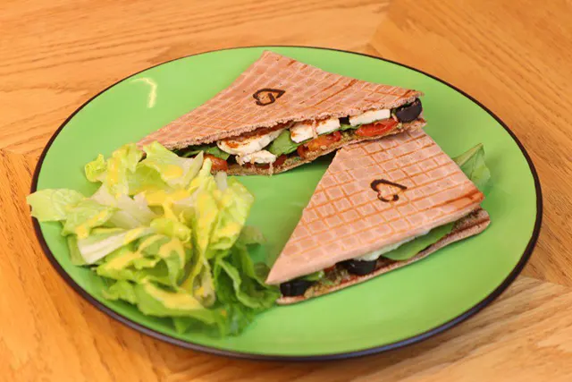 Healthy Panini bread, halloumi, sliced black olives, cherry tomatoes, arugula, pesto sauce.