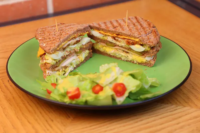 Soft seven-grain toast, grilled chicken, boiled egg, smoked turkey, cheddar cheese, pickles, lettuce, tomatoes, light homestyle sauce.