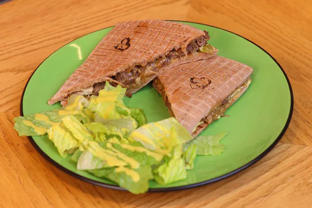 Healthy Panini bread, beef slices, mushroom sauce, mozzarella cheese, light homestyle sauce.